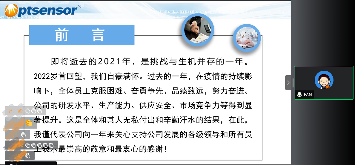 樊維濤總經(jīng)理做了2021年度工作報(bào)告。2021年,和其光電全體員工克服困難、奮勇?tīng)?zhēng)先、品臻致遠(yuǎn),努力奮進(jìn)。公司的研發(fā)水平、生產(chǎn)能力、供應(yīng)安全、市場(chǎng)競(jìng)爭(zhēng)力等得到顯著提升。2022年,和其人將繼續(xù)努力,去攀登更高的山峰。