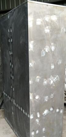 如圖是浦豐柜業(yè)焊接的重型工具柜表面處理過程中的照片。有白點的地方都是厚板焊透后人工打磨凸起的鋼板表面。只有工具柜內(nèi)加強筋和柜體焊透才能保證固體的牢固性。每個焊點再采取汽車表面修補漆面的工藝,進行人工修補原子灰,再進行表面靜電噴塑處理。
